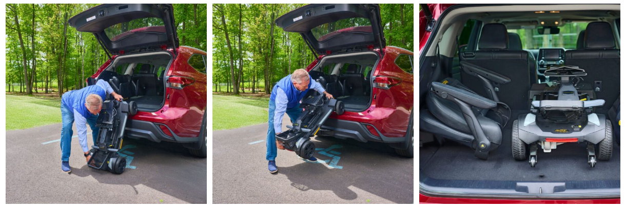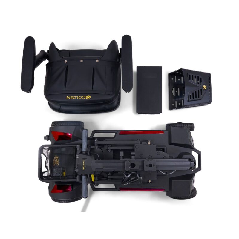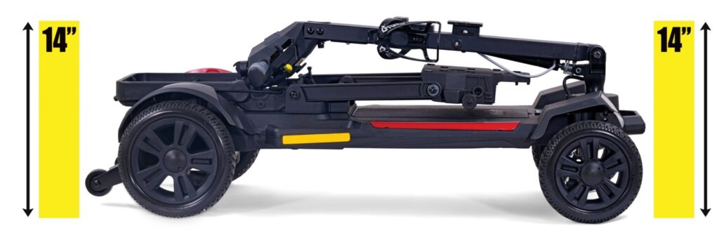 The heaviest piece is only 52.5 lbs. (without the seat and battery) and the height when folded is less than 14″ for storage where space is limited.